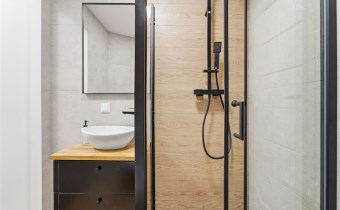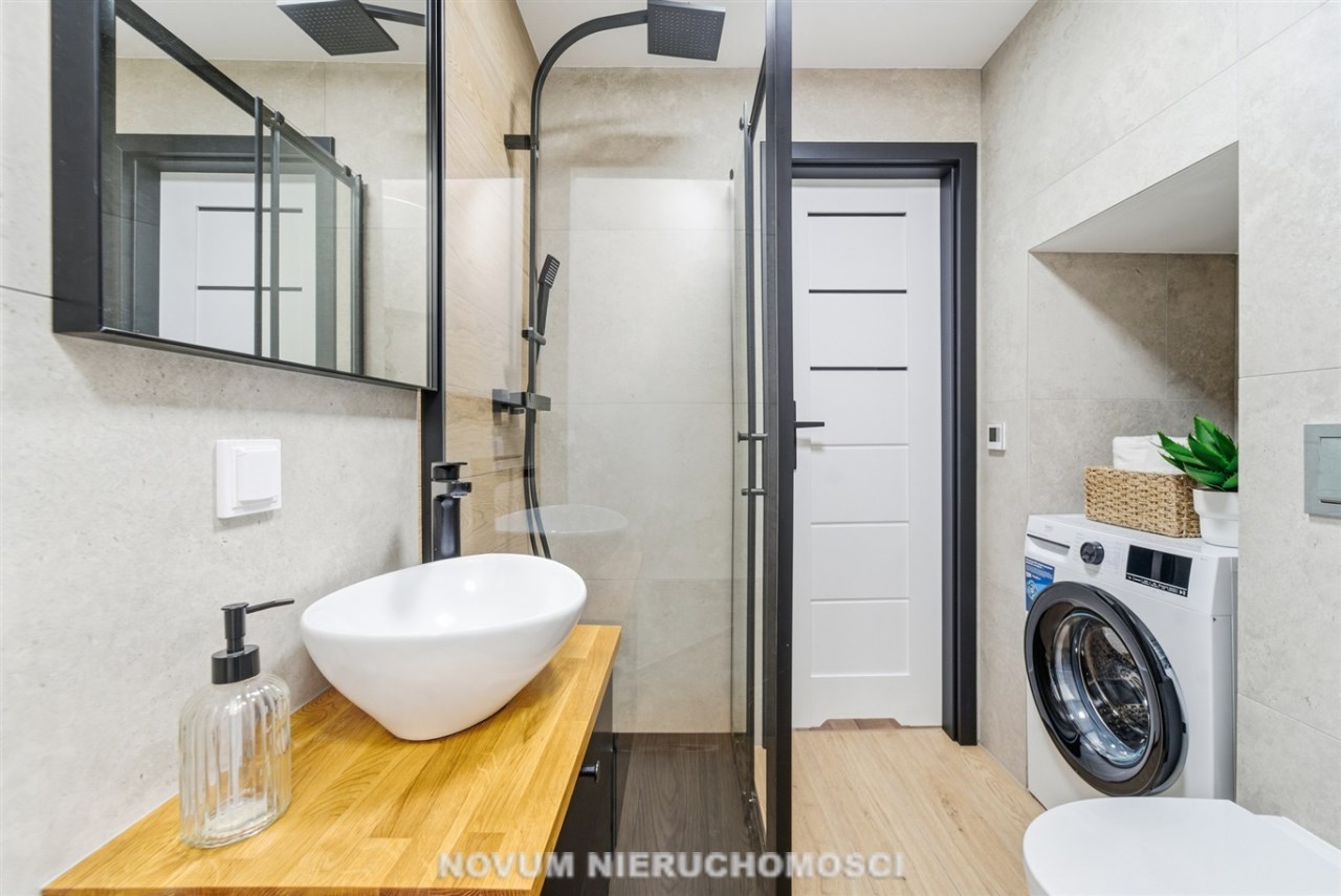 • Łazienka z pomieszczeniem gospodarczym – praktyczne miejsce na pralkę i przechowywanie.